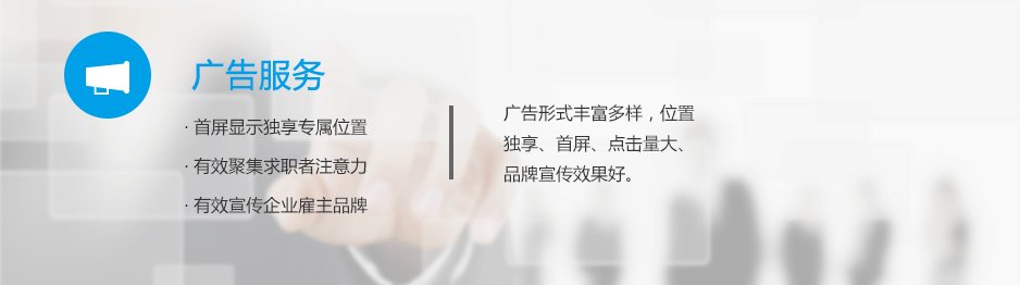 廣告服務(wù)基于龐大的網(wǎng)絡(luò )平臺,位于首屏,企業(yè)客戶(hù)可以在首頁(yè)擁有專(zhuān)享位置,被推薦的職位和公司始終占據求職者的第一視線(xiàn),極大地聚焦求職者的注意力,從而大幅度提升招聘職位的關(guān)注度、點(diǎn)擊量及招聘效果。廣告有知名企業(yè)招聘、熱點(diǎn)招聘、品牌招聘、搜索置頂、海報等多種類(lèi)型。企業(yè)客戶(hù)可根據招聘需求選擇合適的廣告類(lèi)型,完成招聘需求。