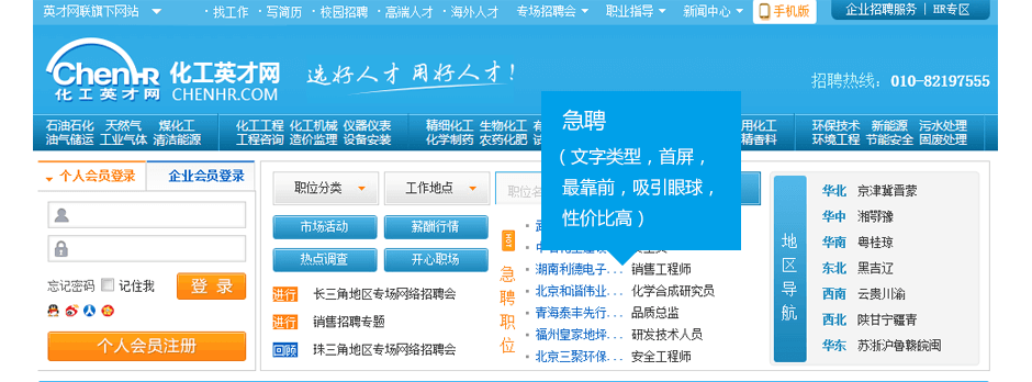 急聘區位于首屏導航下方位置顯著(zhù),極大吸引求職者注意力及對招聘位置的關(guān)注度,有效解決企業(yè)緊急招聘問(wèn)題。